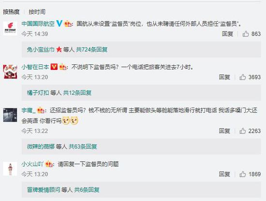 而13日下午2點39分,國航方面終於回應——國航未設置“監督員”崗位,也從未聘請任何外部人員擔任“監督員”。