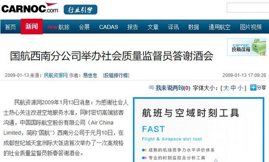 2009年1月10日,國航西南分公司還在成都世紀城天堂洲際大飯店舉辦了一次高規格的“社會質量監督員新春答謝酒會”。