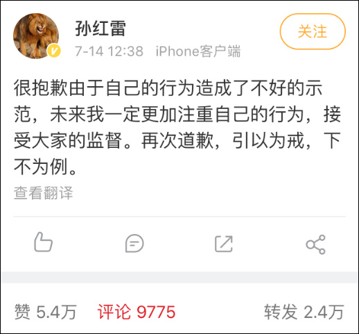 14日中午,孫紅雷通過微博道歉,表示將更加註重自己的行為,接受大家的監督,下不為例。
