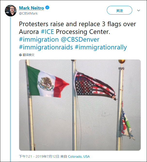 然而,他話音剛落,數百名抗議者當晚就聚集在科羅拉多州奧羅拉市的美國移民和海關執法局大樓外,撤下美國國旗,代之以墨西哥國旗和反“藍命貴”旗幟(Blue Lives Matter,觀察者網注:藍命貴為美國“警察的命也是命”運動的簡稱)。而美國國旗則被倒掛,上面還用紅色噴漆噴上了“廢除ICE”的字樣。