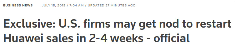 上月29日,在G20大阪峯會閉幕式後,特朗普表示,美國企業可以繼續向華為出售零件。這位美國總統説,美國賣給華為“數量巨大的產品”,“我們會繼續銷售這些產品”。隨後,美國商務部長羅斯也稱,在不影響國家安全的情況下,針對華為的黑名單身份給予豁免。