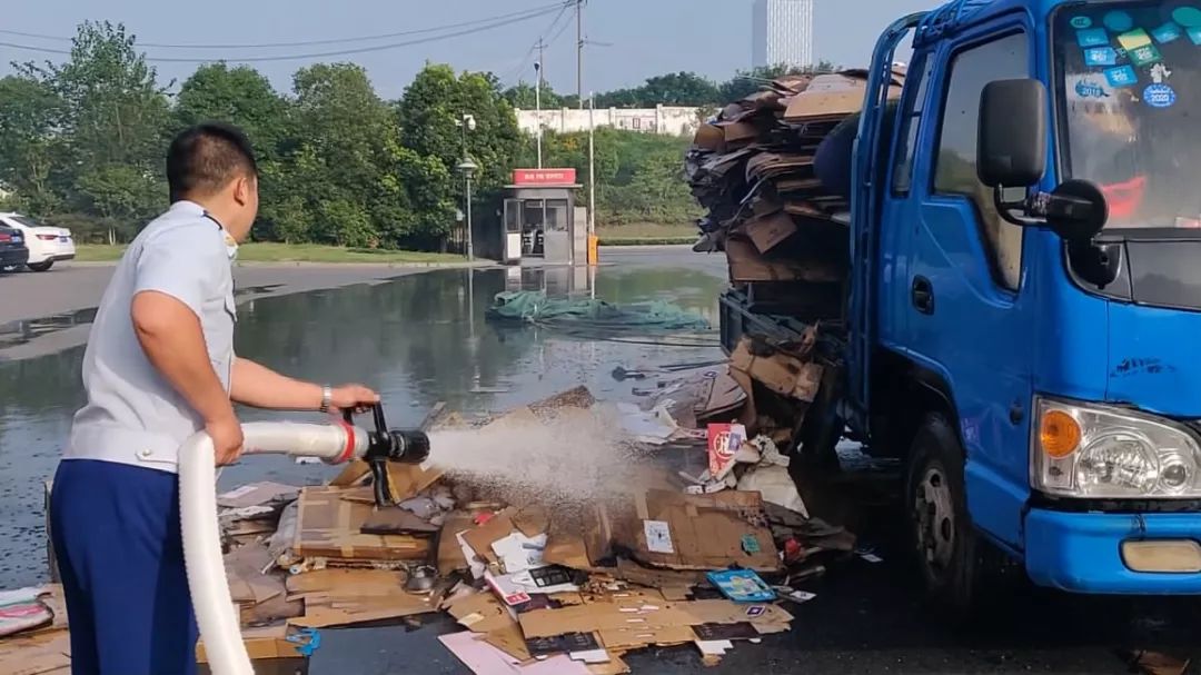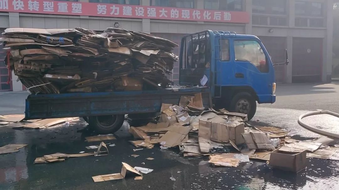 消防員在滅火的同時,還幫助貨車駕駛員將起火部位的紙盒全部扔下貨車,防止蔓延。