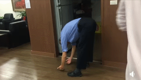 視頻一開始,韓國瑜彎腰用手觸地,費勁地熱着身,看這架勢,估計要為大家表演一段飛踢。
