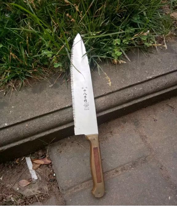 6月21日,河南南陽,一位媽媽用童車推着自己的寶寶在小區內散步,突然,一把廚用刀具從天而降,落至童車右前側的地面上。