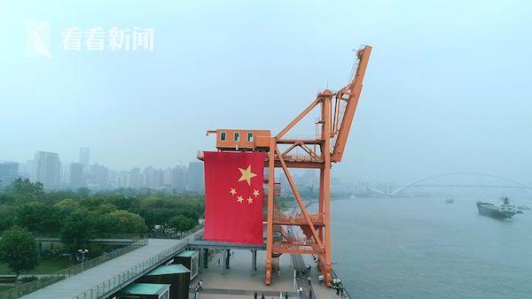 巨幅五星紅旗在塔吊上迎風展開