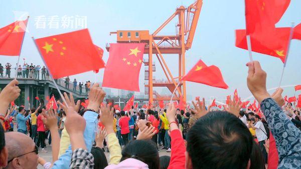船上岸上的人們揮舞着國旗彼此呼應