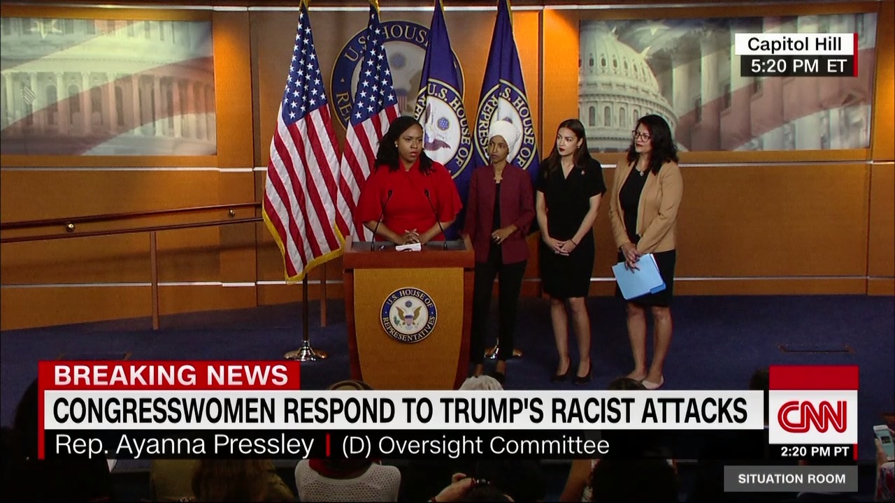 她還説,特朗普最近的言論,“延續了他的種族主義和仇外策略”:“我們不能允許總統的仇恨行動轉移我們的注意力,讓我們無法完成關鍵的工作,讓本屆政府無法對邊境上的非人道條件負責。邊境上的非人道條件將兒童與他們的親人分離開來,把他們關在籠子裏,還有那些非法的恐怖條件。”