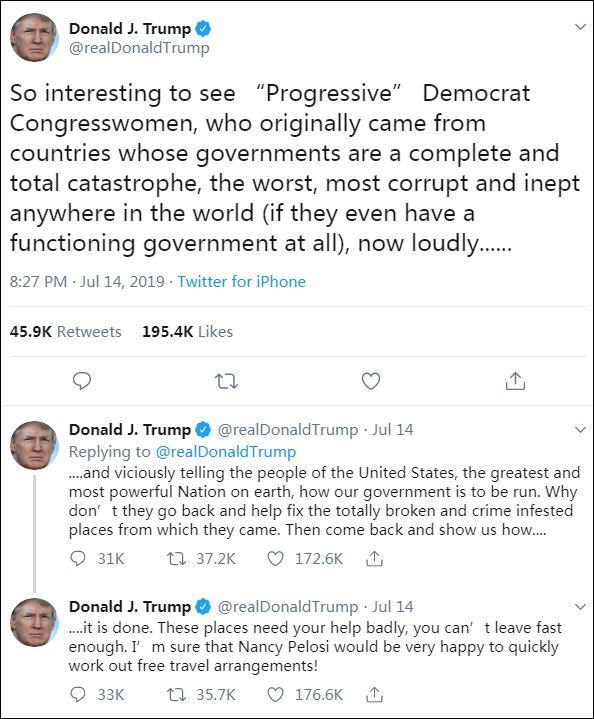上週日(14日),特朗普連發3條推文:“那些民主黨‘進步’女議員真的很有趣。她們原本來自那些世界上最糟糕、腐敗、無能的政府控制下的國家(或者連個正常運作的政府都沒有),現在卻要來惡毒地教美國,這個地球上最偉大和強大的國家的民眾,如何運作我們的政府。她們為什麼不能先回到自己的國家去,把她們犯罪猖獗且一團糟的祖國收拾好呢?這些地方非常需要你們的幫助,你們得儘快去幫忙,我確信南希·佩洛西會很樂意給你們免費安排行程的!”