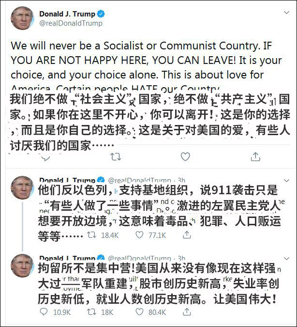 就在這4位民主黨女議員開始發佈會的時候,另一邊,特朗普又開始在推特“開炮”。像週日(14日)一樣,特朗普繼續讓她們“不開心就離開美國”。
