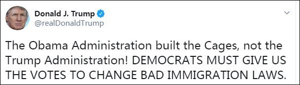 不過,對於這些指責,特朗普一早就把責任推給了前任奧巴馬政府:“是奧巴馬政府建的籠子,不是特朗普政府建的!民主黨人必須給我們投票,來改變糟糕的移民法。”