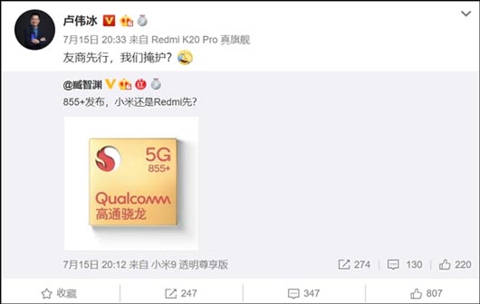 最有意思的是小米,其手機產品市場總監臧智淵在微博提問:驍龍855 Plus發佈,小米還是Redmi先用?而小米集團副總裁、紅米Redmi品牌總經理盧偉冰回覆,友商先行,我們掩護?