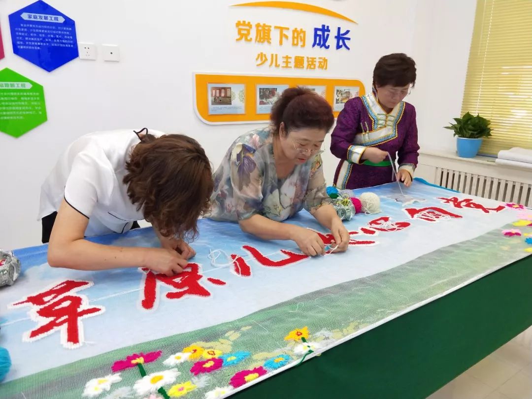 △社區的蒙古族、漢族同胞正在聯手製作刺繡作品《草原兒女心向黨》。(國廣記者蔡靖驫拍攝)