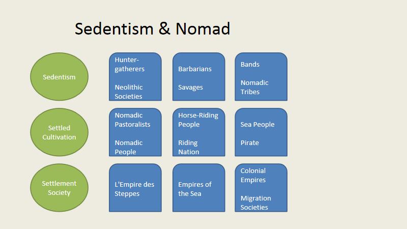 與定居SEDENTISM相對的英文詞是NOMAD. 這個詞本來的定義是指所有“沒有固定居住地的人羣社團”,並不專指遊牧社會,也指沿貿易路線遊走的商隊或過着流浪生活的吉普賽手藝人等,所以應該相對於漢語的“定居”翻譯為“遊居”。實際上,根據人類學和考古學的研究,原始人類社會最早的狀態都是遊居的,也就是通常所説的狩獵採集部落。從追隨動植物變遷一起遊居的狩獵採集生產生活方式,轉變為永久留在一個地方從事農耕和養殖的生產生活方式,是一個很重大的轉變,也是文明朝向複雜性增加方向的一個大的跨越。