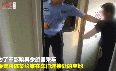 為了不影響其餘旅客乘車,乘警將陳某約束在車門連接處的空地,但醉酒的陳某不僅不聽乘警的勸告,還不時腳踹列車車門,對乘警拳打腳踢。乘警對其多次警告無效後,為了周邊旅客的人身安全,依法採取措施將其控制。