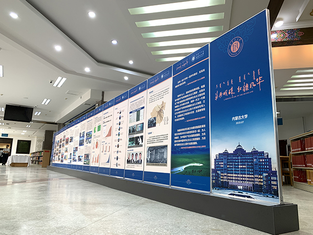 △以“草原明珠、北疆風華”為主題的內蒙古大學校史展板。(央視記者邢彬拍攝)