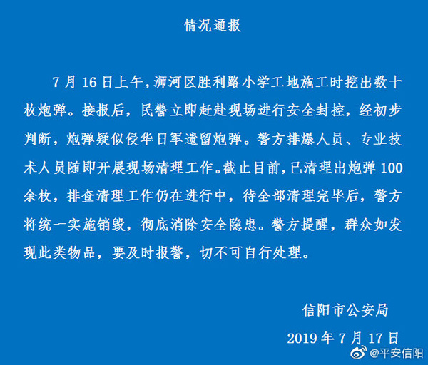河南省信陽市公安局官方微博@平安信陽 7月17日發佈情況通報,7月16日上午,溮河區勝利路小學工地施工時挖出數十枚炮彈。接報後,民警立即趕赴現場進行安全封控,經初步判斷,炮彈疑似侵華日軍遺留炮彈。警方排爆人員、專業技術人員隨即開展現場清理工作。截至目前,已清理出炮彈100餘枚,排查清理工作仍在進行中,待全部清理完畢後,警方將統一實施銷燬,徹底消除安全隱患。