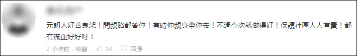 “元朗人很善良的!問路都會回答你!有時候還親自給你帶路!不過這次做得好!保護社區人人有責!都沒有流血很好啊!”