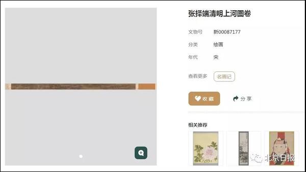 以“清明上河圖”為例,打開它的詳情頁,不僅可以看到相應的文物號和年代,更能點擊放大鏡按鈕,詳細欣賞各處細節。