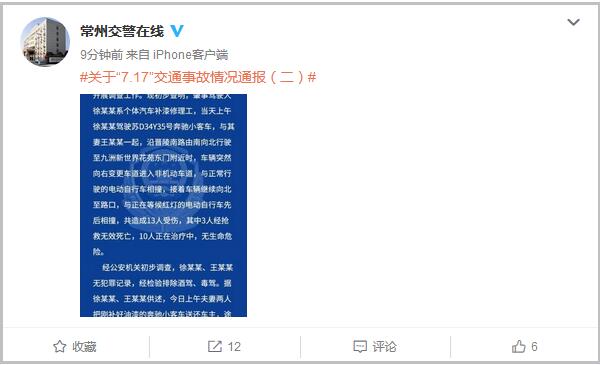 江蘇省常州市公安局交巡警支隊官方微博@常州交警在線7月17日發佈“7.17 道路交通事故”續報稱,針對7月17日上午發生在常州市天寧區晉陵中路的交通事故,公安機關依法迅速開展調查工作。現初步查明,肇事駕駛人徐某某繫個體汽車補漆修理工,當天上午徐某某駕駛蘇D34Y35號奔馳小客車,與其妻王某某一起,沿晉陵南路由南向北行駛至九洲新世界花苑東門附近時,車輛突然向右變更車道進入非機動車道,與正常行駛的電動自行車相撞,接着車輛繼續向北至路口,與正在等候紅燈的電動自行車先後相撞,共造成13人受傷,其中3人經搶救無效死亡,10人正在治療中,無生命危險。