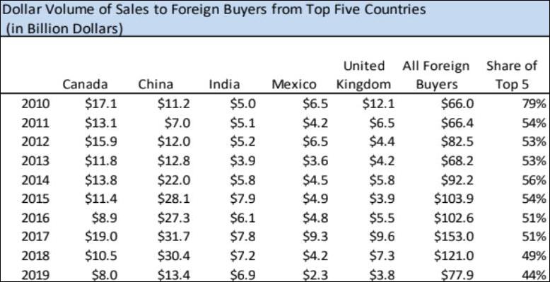 前5大買家中,排在中國之後的為加拿大,買入的住宅總值為80億美元,接着是印度(69億美元)、英國(38億美元)以及墨西哥(23億美元)。
