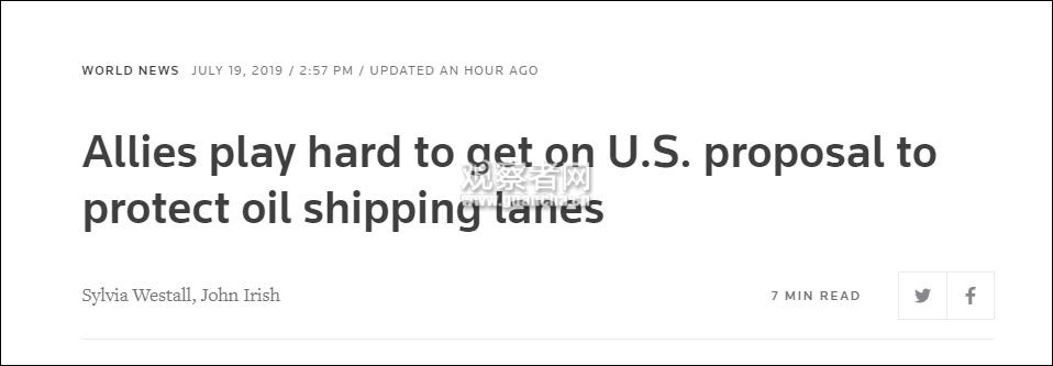 路透社今天(19日)採集到的來自英、法、日、沙特等國官方匿名人士觀點,他們認為,“護航聯盟”存在“軍事意味”,會進一步令伊朗局勢惡化,有人甚至指出,不想因為美國要對付伊朗,就被捲入衝突之中。