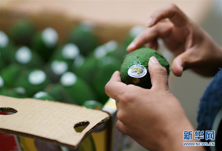 2017年6月3日,在墨西哥米卻肯州烏魯阿潘市的一家牛油果裝箱工廠,一名工人為牛油果貼上“合格”標籤。新華社記者淡航攝