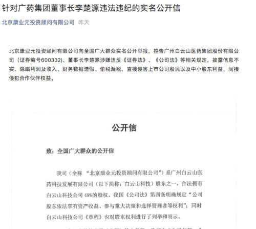 7月18日,公開信的發佈者北京康業元投資顧問有限公司(簡稱“康業元”)稱,白雲山及其董事長李楚源存在信息披露不實、隱瞞利潤及收入、財務數據造假、偷税漏税等侵犯股民權益的行為。