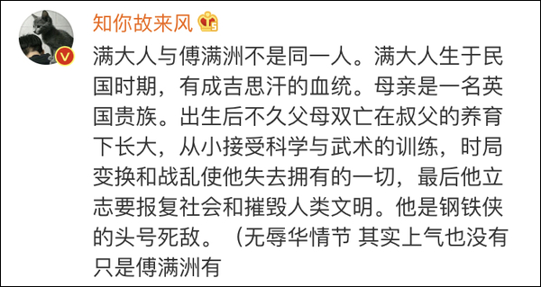 許多網友將滿大人誤認為傅滿洲,因為二者多少都帶着一點“黃禍論”的色彩。