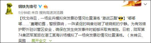 據陸軍第74集團軍官方微博@鋼鐵先鋒號 7月22日消息,“嘟嘟嘟……”晨曦初露,警報驟響,一陣緊促的哨音劃破了破曉前的寧靜。為有效維護野外駐訓營區安全,確保在發生突發事件時能夠採取有措施。日前,陸軍第74集團軍某旅在湛江某海訓場模擬了一場突發暴恐情況處置演練。