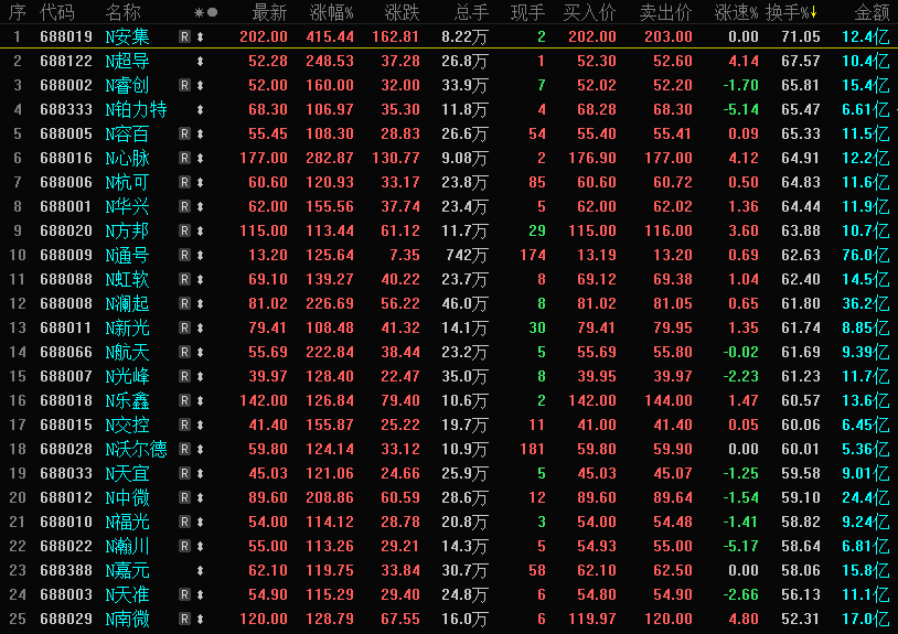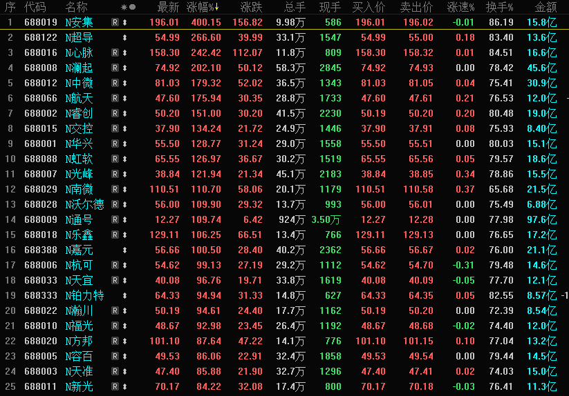 25只科創板股票全天漲幅均超80%,16家公司漲幅翻倍,其中,N安集漲400.15%位居榜首,而N通號市值突破千億,達1299億元。N容百、N新光和N安集等7只個股出現兩次臨停。