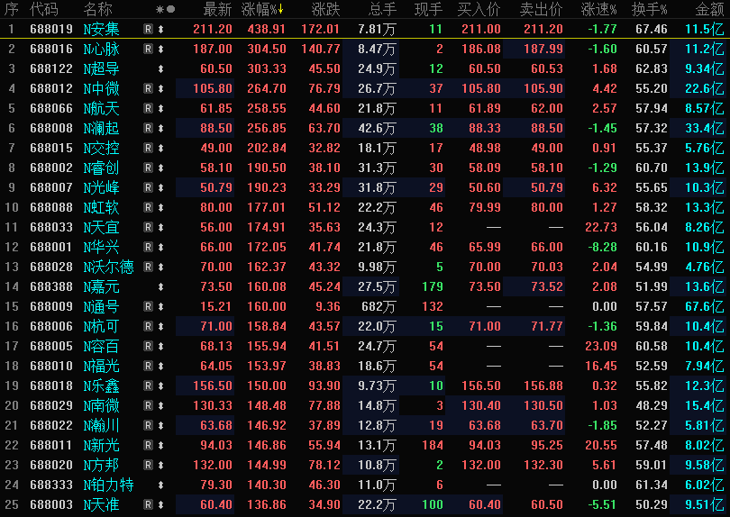 上市交易後,首批25家科創板公司開盤全部大幅上漲,19只股票漲幅超1倍。其中,漲幅最高的N安集大漲287.85%;漲幅最低的N新光也上漲57.52%。