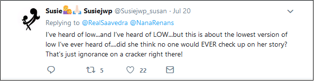 “我聽説過有些low的事情…我也聽過很low的事情…但這是我聽過的關於low的最low的版本…她難道認為沒人會核實她的故事麼?…”
