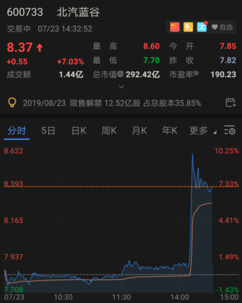 受此消息影響,北汽藍谷拉昇一度漲停,股價報8.60元/股。