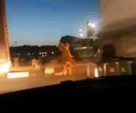 行車記錄儀拍攝的視頻顯示,這個穿着霸王龍玩偶服的人,正在街道上狂奔,似乎是剛剛參加了類似化裝舞會的活動。