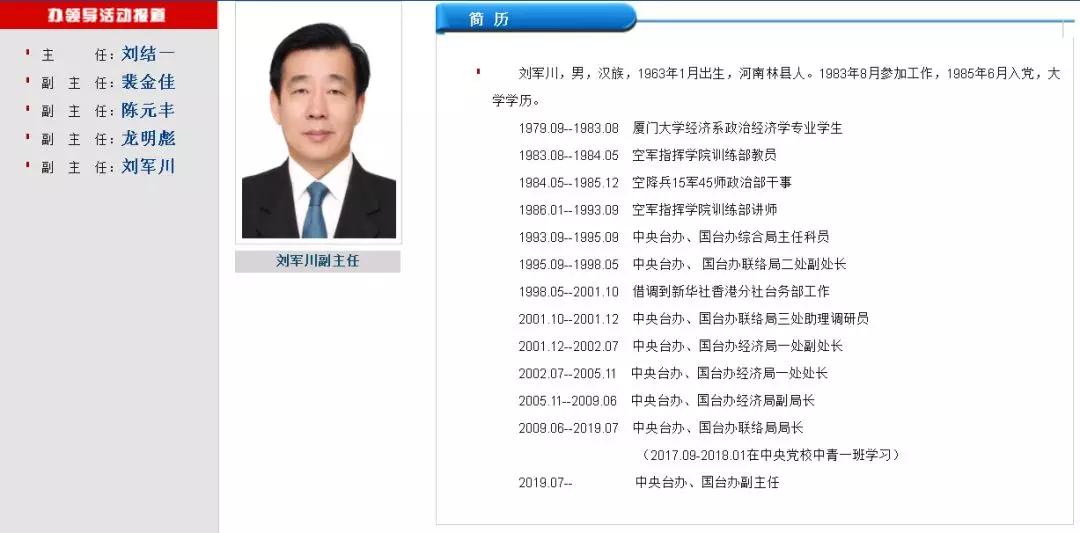 官方資料顯示,劉軍川任國台辦聯絡局局長期間,主要負責對台有關政黨和團體等聯絡工作,承擔台灣重要團組和人士來訪等接待安排工作,指導並協調中央有關部門和地方台辦的對台聯絡工作。