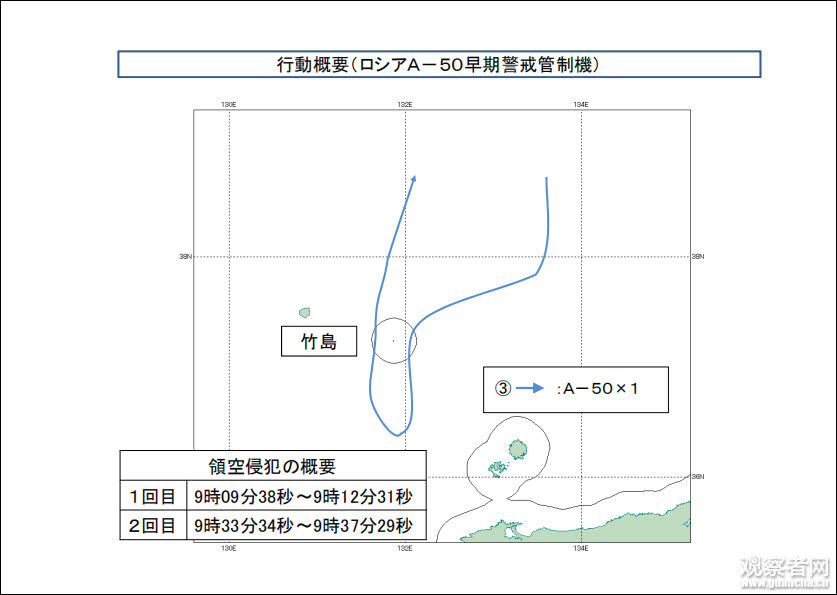 另據韓聯社報道,韓國聯合參謀部通報,週二當天上午9點,一架俄羅斯預警機兩次進入日韓爭議島嶼獨島(日方稱竹島)領空,韓國軍機隨後向其發射了360枚炮彈警告。