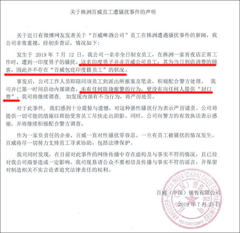 20日,一網友發文,本月12日,在湖南株洲百威啤酒公司兼職期間遭遇印度籍員工糾纏、威脅恐嚇、強行的猥褻事件,時間長達數分鐘。