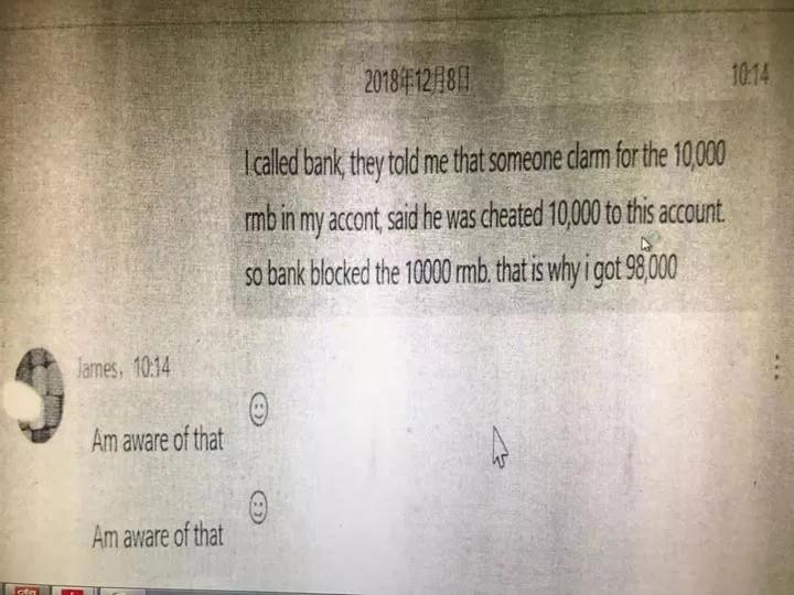 周先生雖然想到錢可能來路不正,卻沒有第一時間聯繫警方,而是自行搜索並向銀行方詢問原因,在沒有得到確切答案,甚至有銀行告訴他卡里的錢是詐騙所得後,他仍舊沒有報警,而是在聊天軟件上找到詹姆斯詢問原因,那一頭詹姆斯保證,錢是合法的,應該是個誤會,銀行卡不久就會解凍的。