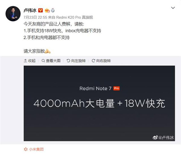 昨日(23日)晚間,小米集團副總裁、紅米Redmi 品牌總經理@盧偉冰 在微博發文稱,“今天友商的產品讓人費解,請教: 1、手機支持18W快充,inbox充電器不支持;2、手機和充電器都不支持”。
