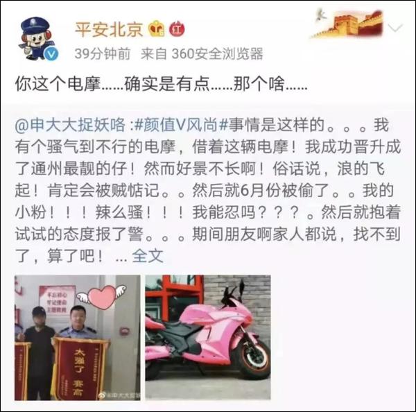 近日,網友@申大大捉妖咯 以及自家失而復得的電摩在微博上火了。