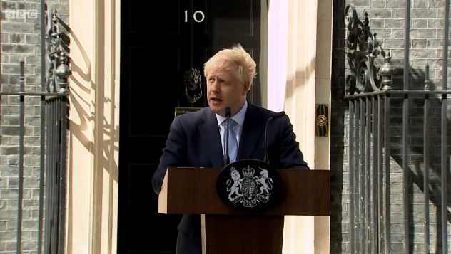 約翰遜24日在唐寧街10號門口演講 BBC視頻截圖