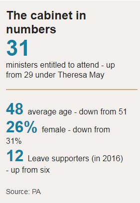 根據BBC統計,約翰遜的內閣成員共31人,比梅的29人增加2人。內閣成員平均年齡從51歲降至48歲。女性在約翰遜內閣佔比26%,比梅時期的31%有所下降。此外,現在的內閣中有12人是2016年公投時期的脱歐支持者,梅的內閣中只有6人。