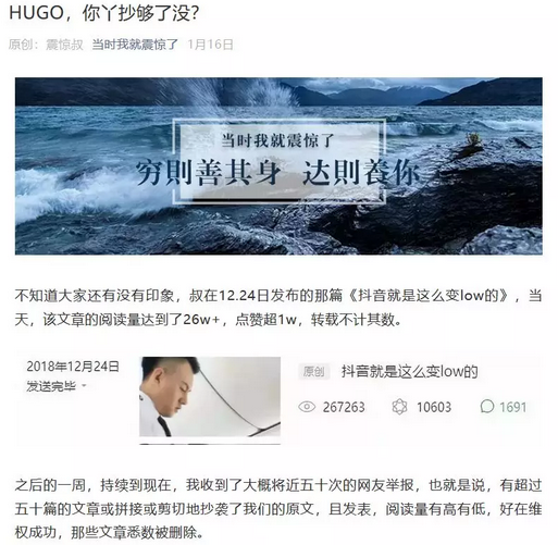 此外,HUGO還不時被同行發文斥責抄襲洗稿。比如,1月16日,自媒體“當時我就震驚了”發表文章《HUGO,你丫抄夠了沒?》,怒斥HUGO 1月15日發的文章《抖音就是這麼變low的》抄襲其2018年12月24日發佈的同名文章,並表示“HUGO”在多次找他轉載文章遭拒後直接搬運大段文字。”