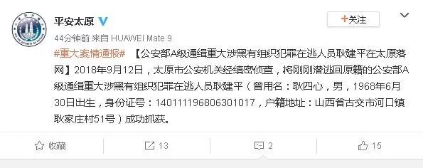 2018年9月12日,太原市公安機關經縝密偵查,將剛剛潛逃回原籍的公安部A級通緝重大涉黑有組織犯罪在逃人員耿建平成功抓獲。