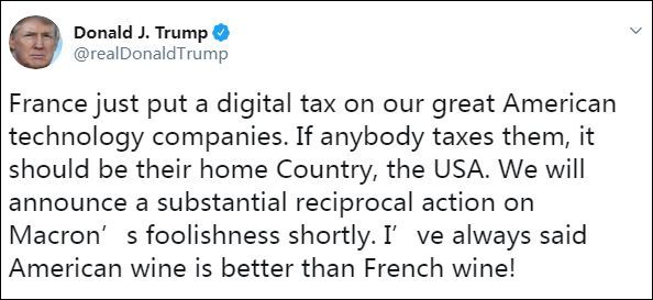 不出意料,美國總統特朗普生氣了,點名馬克龍很“愚蠢”,並誓言報復很快就來。他7月26日發了條憤怒的推特:“法國剛剛對我們偉大的美國科技公司徵收了數字税。如果有人向他們徵税,那也應該是他們的祖國——美國。對馬克龍的愚蠢行為,我們將很快宣佈實質性的對等行動。我一直説,美國葡萄酒比法國葡萄酒好。”