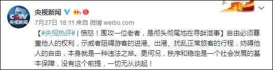 @央視新聞 7月27日表示,憤怒!圍攻一位老者,是徹頭徹尾地在尋釁滋事。自由必須尊重他人的權利,示威者阻礙遊客的進港、出港、擾亂正常旅客的行程,妨礙他人的自由,本身就是一種違法之舉。更何況,秩序和穩定是一個社會發展的基本保障,沒有這個前提,一切無從談起!