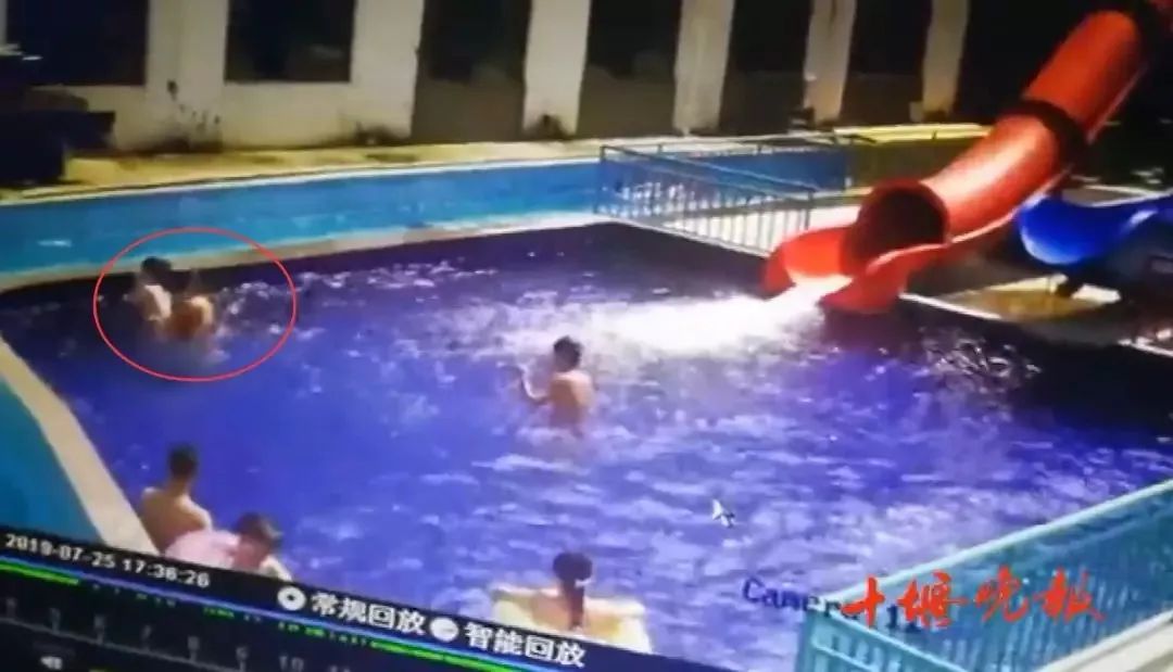 當小張在玩水上滑道時,滑道出口處一個男子主動將落入水中的她扶起,並一直摟着小張的腰將她扶到水池邊。