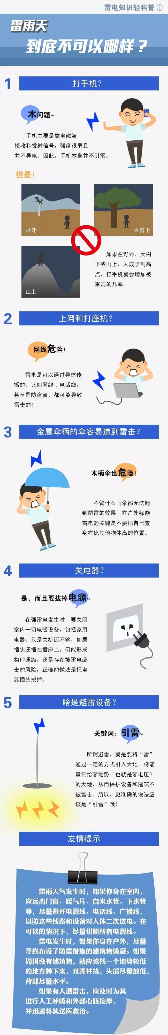 雷雨天還留在室外活動實在是太危險了!如果來不及回到室內,我們該如何保護自己?呆在室內又有哪些注意事項?這些保命知識你一定要知道↓↓
