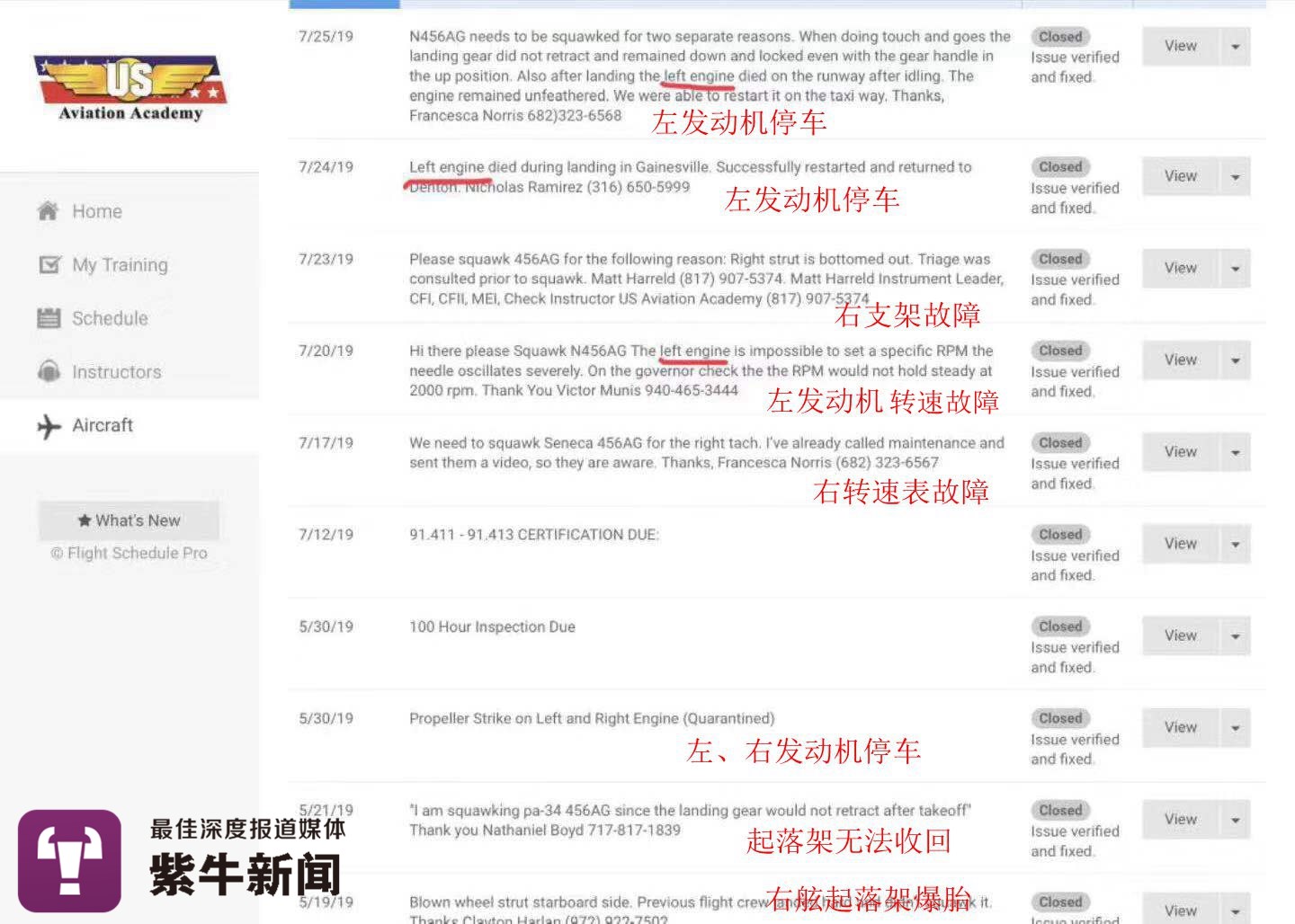 一份N456AG號飛機的故障報告顯示,僅在今年5月份以來,這架飛機的起落架、發動機轉速錶、飛機支柱等都出現過問題。更為嚴重的是,7月20日、24日和25日連續遇到左發動機故障。