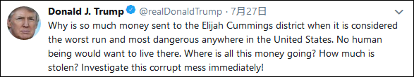 當地時間7月27日,特朗普發佈了多條攻擊黑人眾議院監督委員俄拉吉·卡明斯及其轄區巴爾的摩的推文,推文中寫道:“卡明斯管轄的區域(指巴爾的摩)很噁心,鼠蟲肆虐,髒亂不堪,要是他在巴爾的摩多待一會,也許可以幫着清理一下那危險又骯髒的地方。”